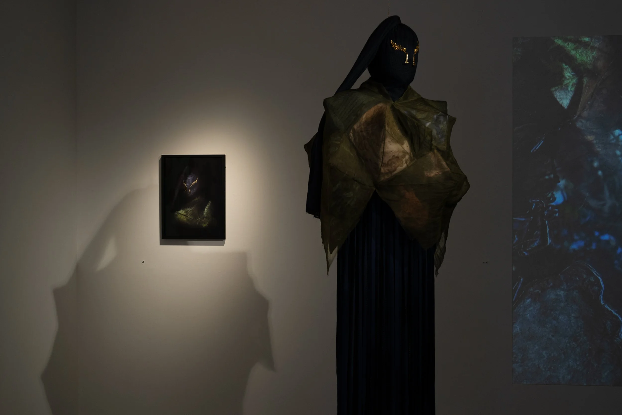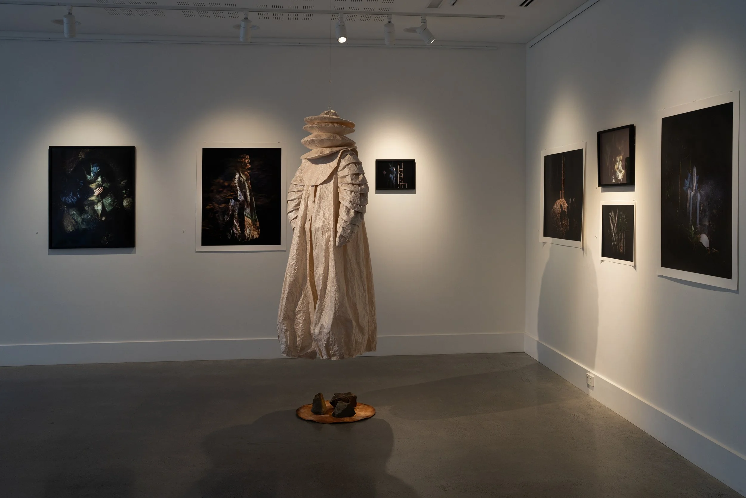 In this installation, the artist explores the body as a meeting place between the human and non-human world, examining the tension that arises from being bound within a physical form. Photography, sculpture, and film become ritualised gestures of connection, blending figure, wearable sculpture, and landscape into forms that receive and reflect. The wearable sculptures function as a type of ceremonial vesture, designed to attune the senses and heighten awareness. Drawing on the time-honoured human tradition of ritual, Moon Pool becomes a site for resonance – inviting viewers to slow down, feel, and listen for the subtle movements that pulse beneath the surface of things.